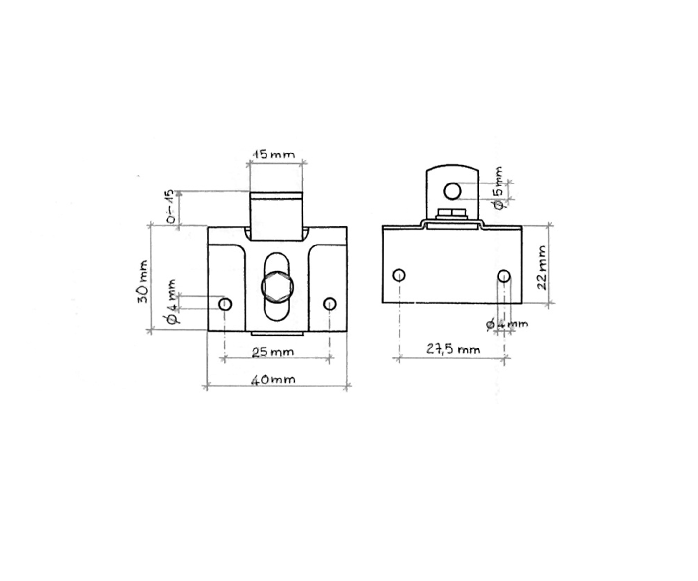 Registrabile in tre direzioni. Parte portante in acciaio. Fissaggio a spine Ø mm. 10. Interasse mm. 32, utilizzabile sia con tassello a gancio sia scorrevole su barra.