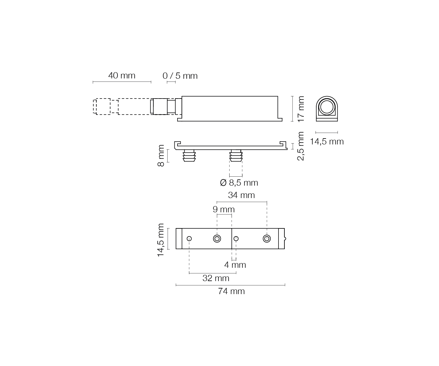 Corsa mm.  40 con paracolpo, fissaggio con basetta a spine.