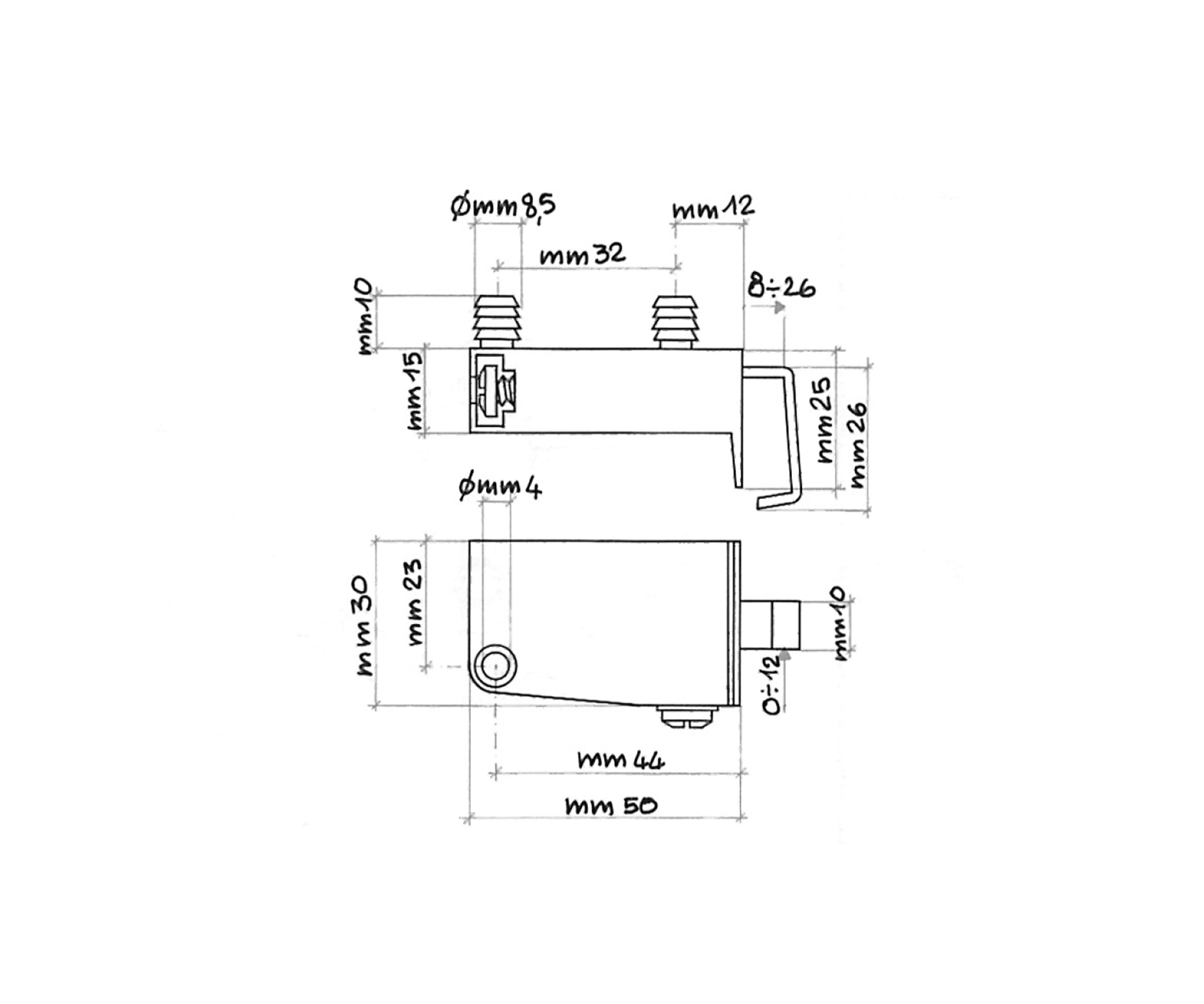 Adjustable into three directions. Load-bearing structure made of steel. Fixing by pins Ø mm. 8. Axle spacing mm. 32, usable both with steel anchor with hook or bar.