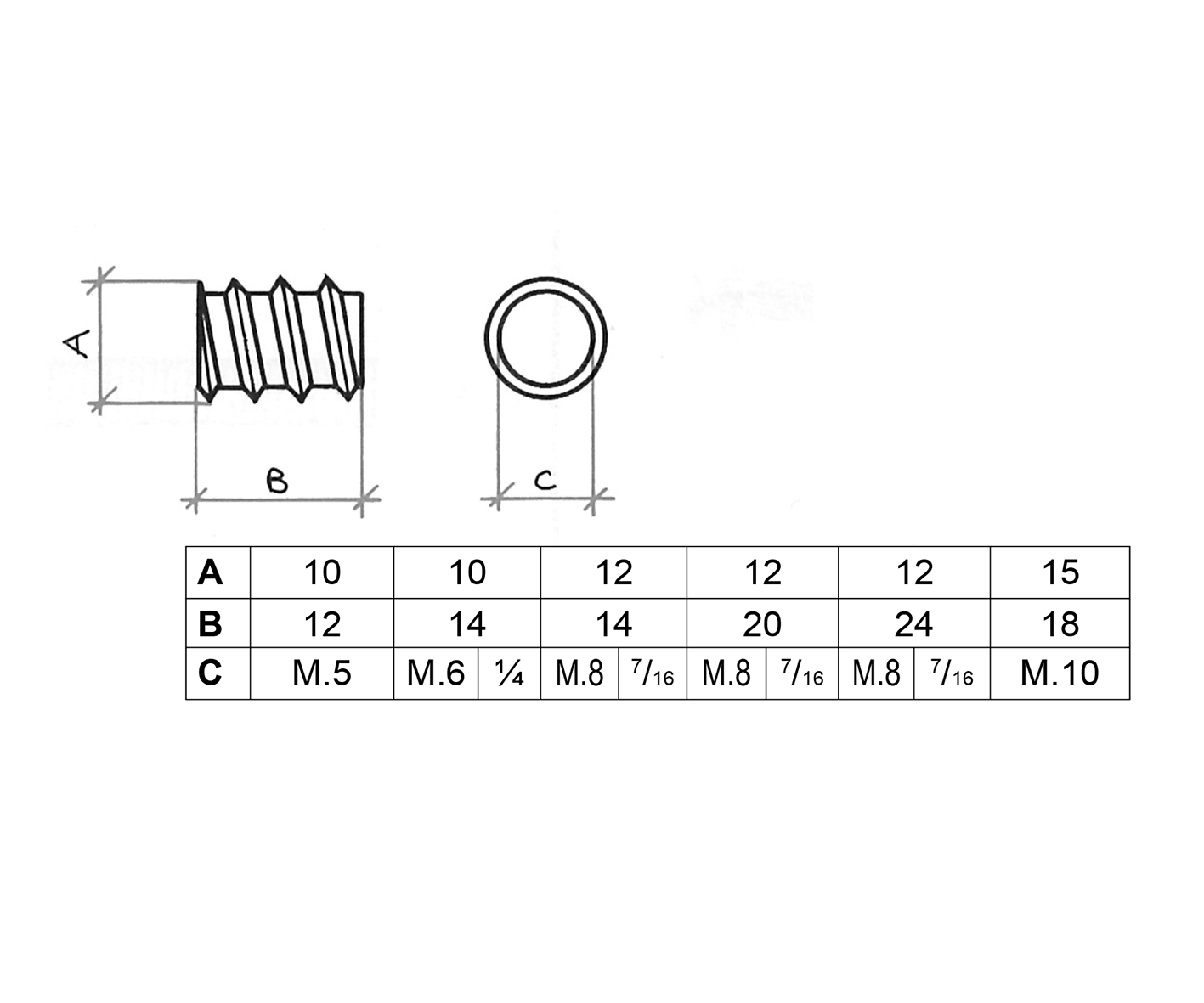 | Measures | M. 5×12 Ø mm. 10, M. 6×14 Ø mm. 10, M. 8×14 Ø mm. 12, M. 8×24 Ø mm. 12, M. 10×18 Ø mm. 15 |
