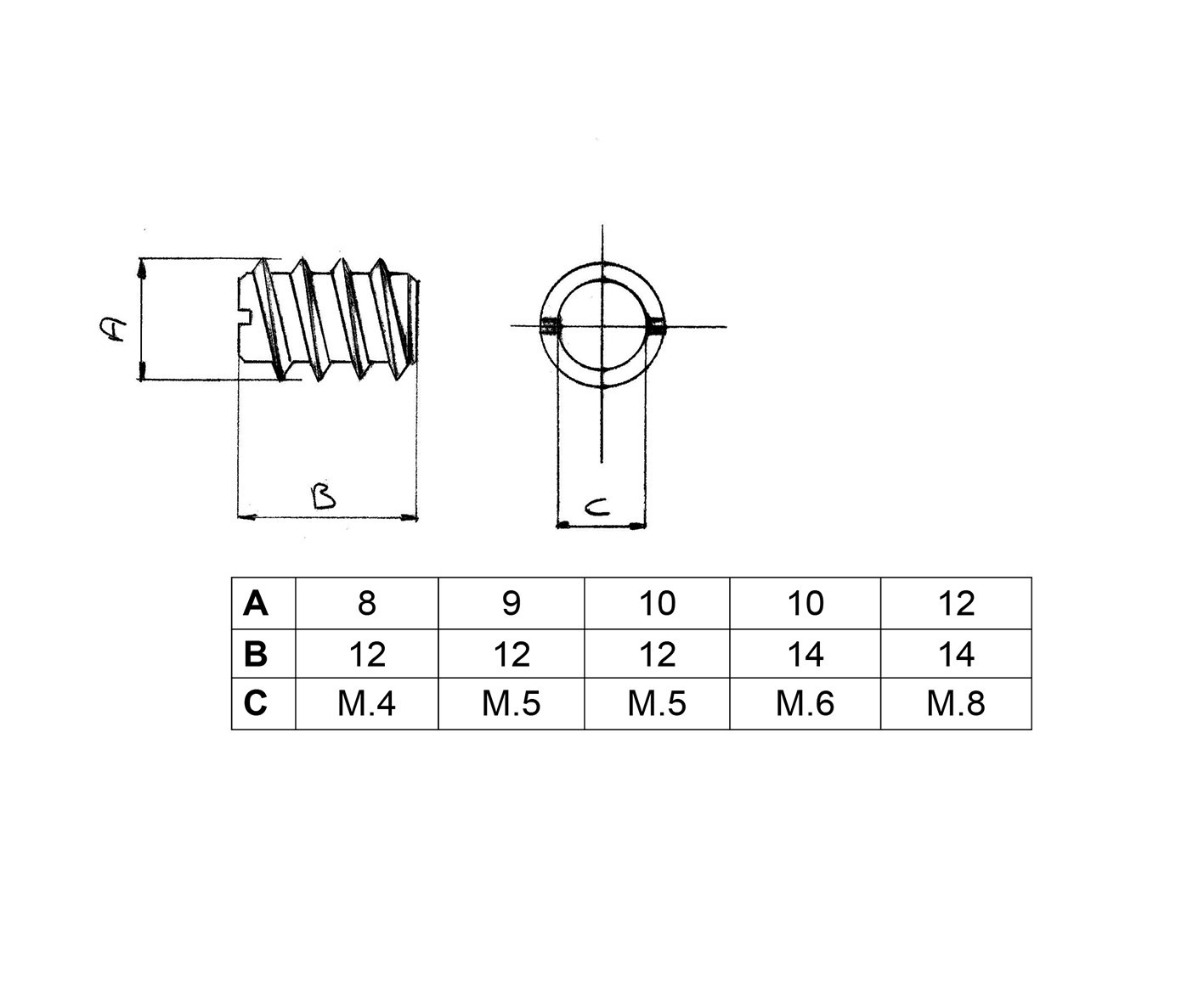 | Misure | M. 4×12 Ø mm. 8, M. 5×12 Ø mm. 9, M. 5×12 Ø mm. 10, M. 6×14 Ø mm. 10, M. 8×14 Ø mm. 12 |