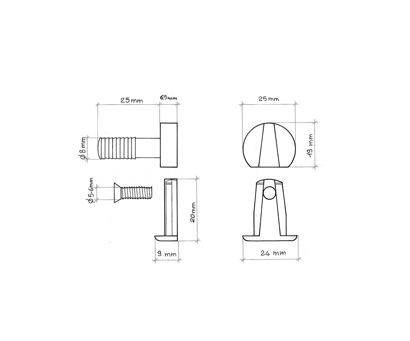 Tirantino 7x36xM.6, bussola ottone art. 0132 10x14xM.6 o nylon art. 0513 11x11xM.6, fondello plastica.